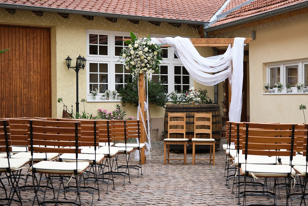 Der angrenzende, liebevoll gestaltete Innenhof bietet in den warmen Monaten die Möglichkeit für gemütliche Feiern.