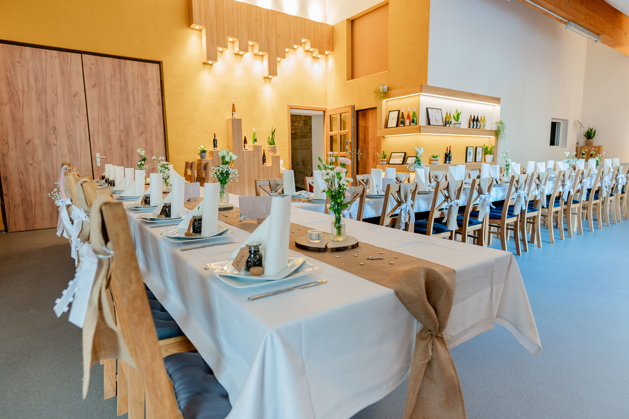 Unsere WeinBar bietet Platz für bis zu 50 Personen. Zusammen mit der großen Eingangshalle und dem Innenhof haben über 150 Personen ausreichend Platz zum Feiern.